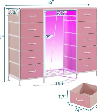 LUMTOK 2-in-1 Dresser with Hanging Rack, 10 Drawers Dresser for Bedroom,Dressers with Fabric Drawers,LED Lights, Charging Station and Hanging Racks for Bedroom (Pink)
